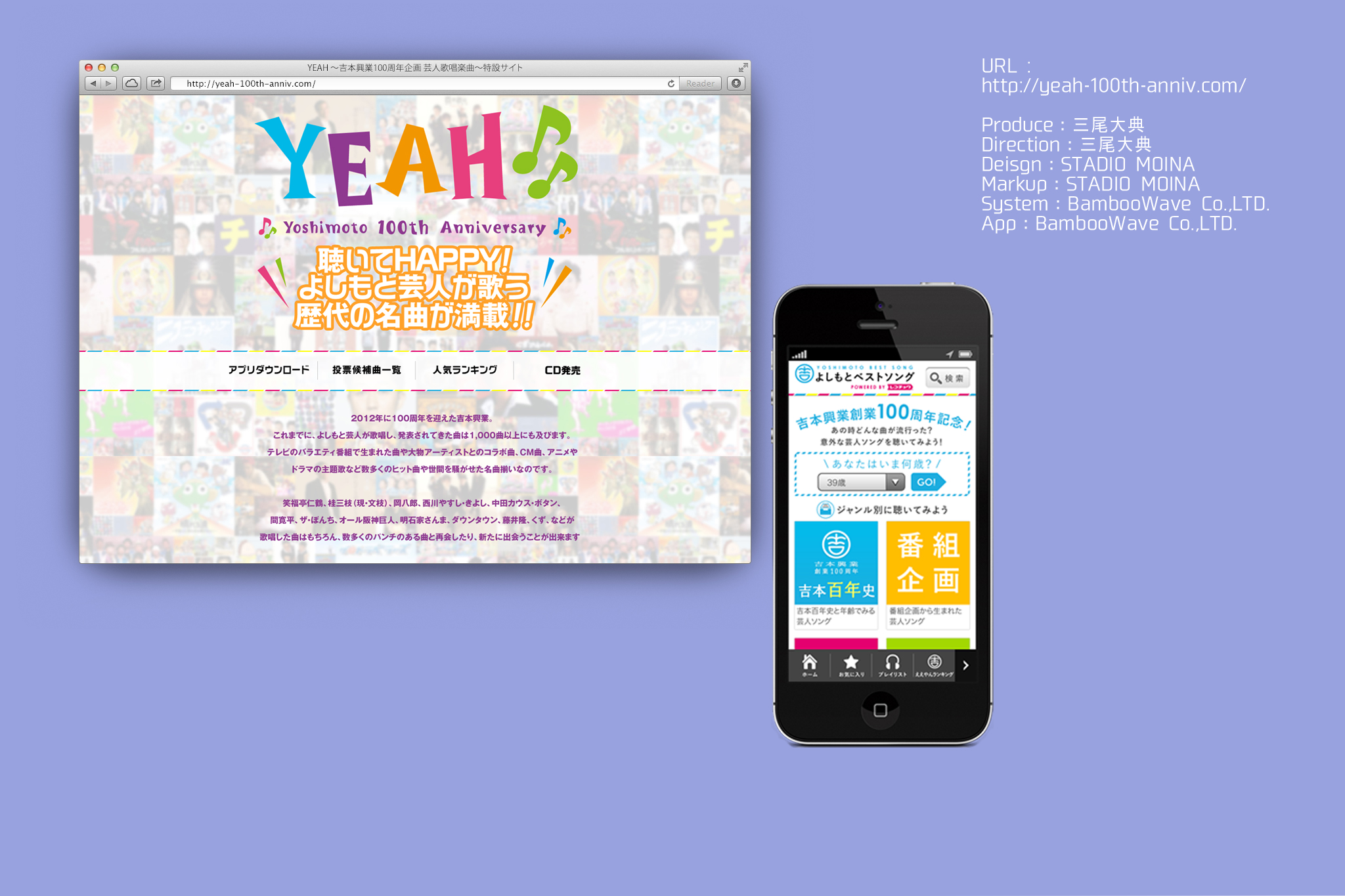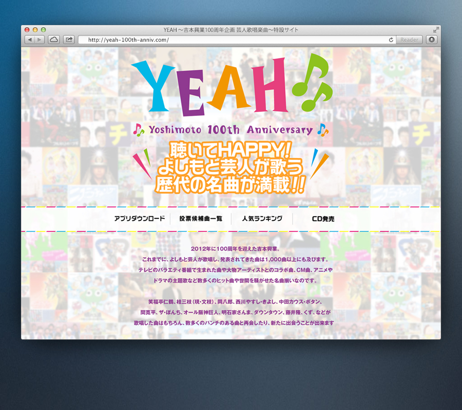アプリでは、名曲リストはもちろん、吉本百年史と合わせて年代別に懐かしい曲やテレビのバラエティ番組から生まれたキャラクターや企画による曲を紹介。映画やドラマ主題歌等、それぞれのニーズに応じてジャンル分け。