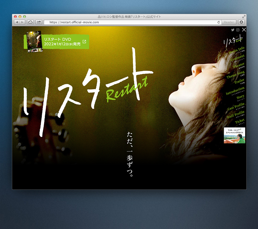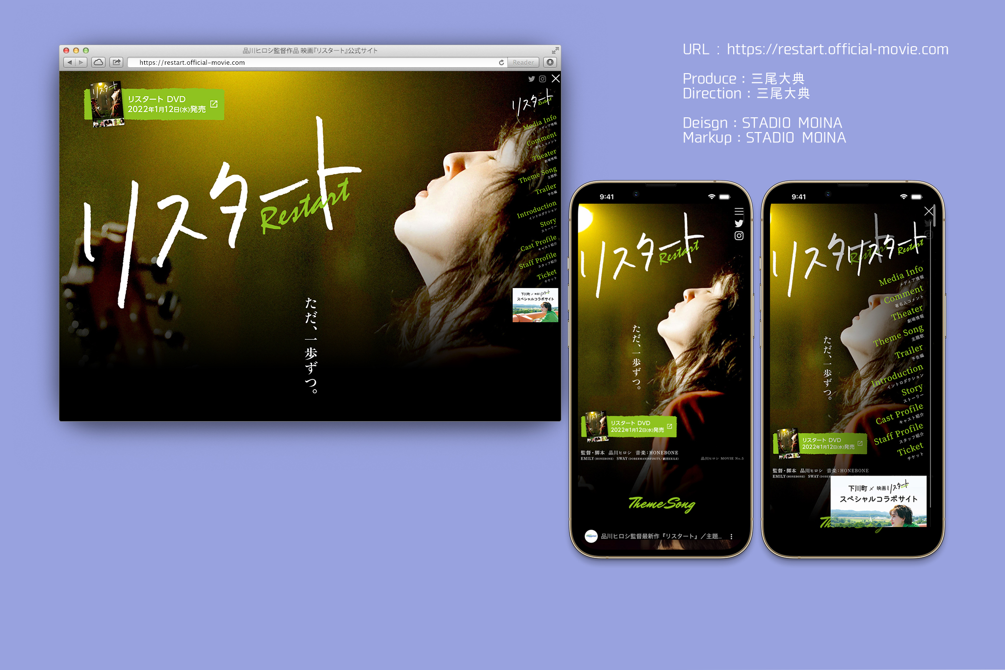 リスタートのロゴに合わせメニューも斜めに配置。最近映画サイトの制作がなくなっていたので気合が入った制作となりました。