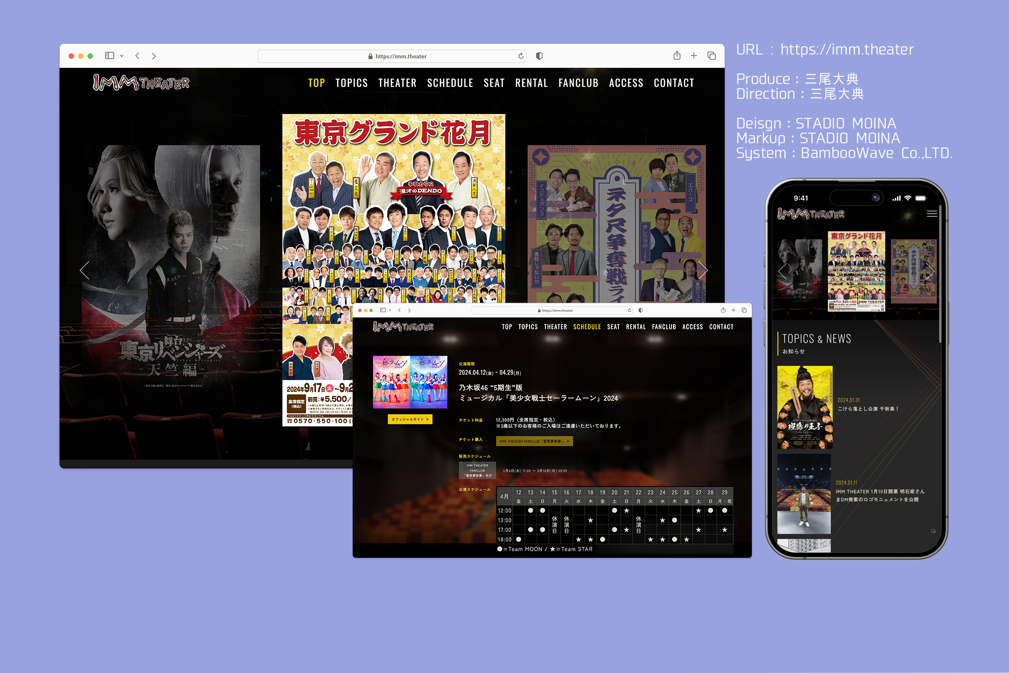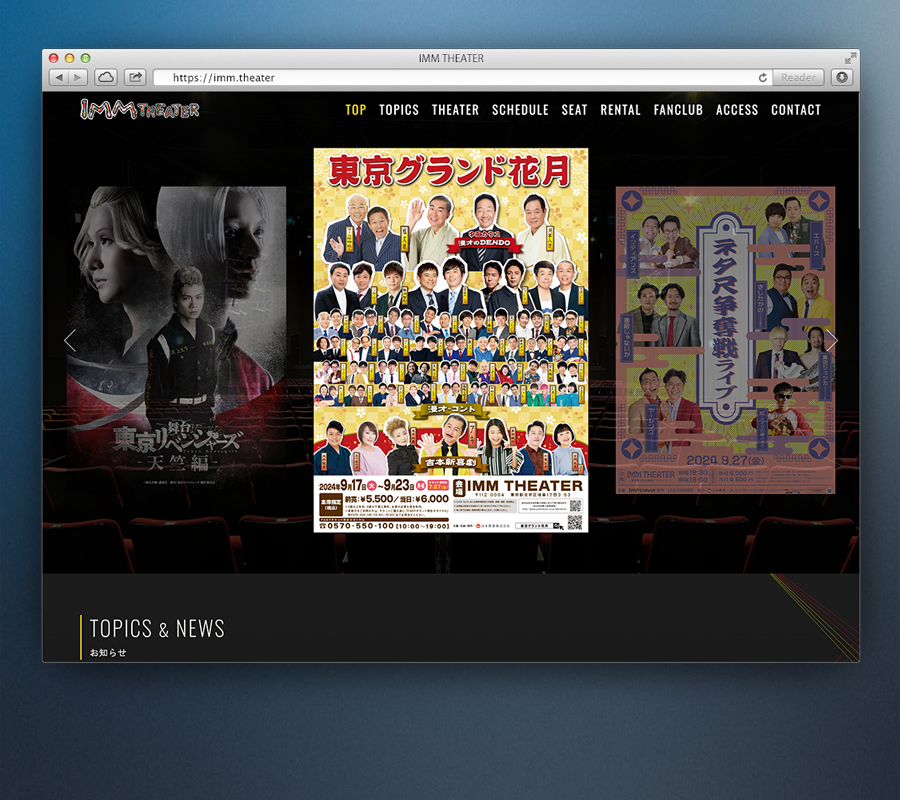 演劇用の劇場サイト。公演される演目の情報は企画会社によってまちまちで、、項目情報に、プレイガイド違いのチケット情報などすみずみまで対応できる管理システムを構築しました。